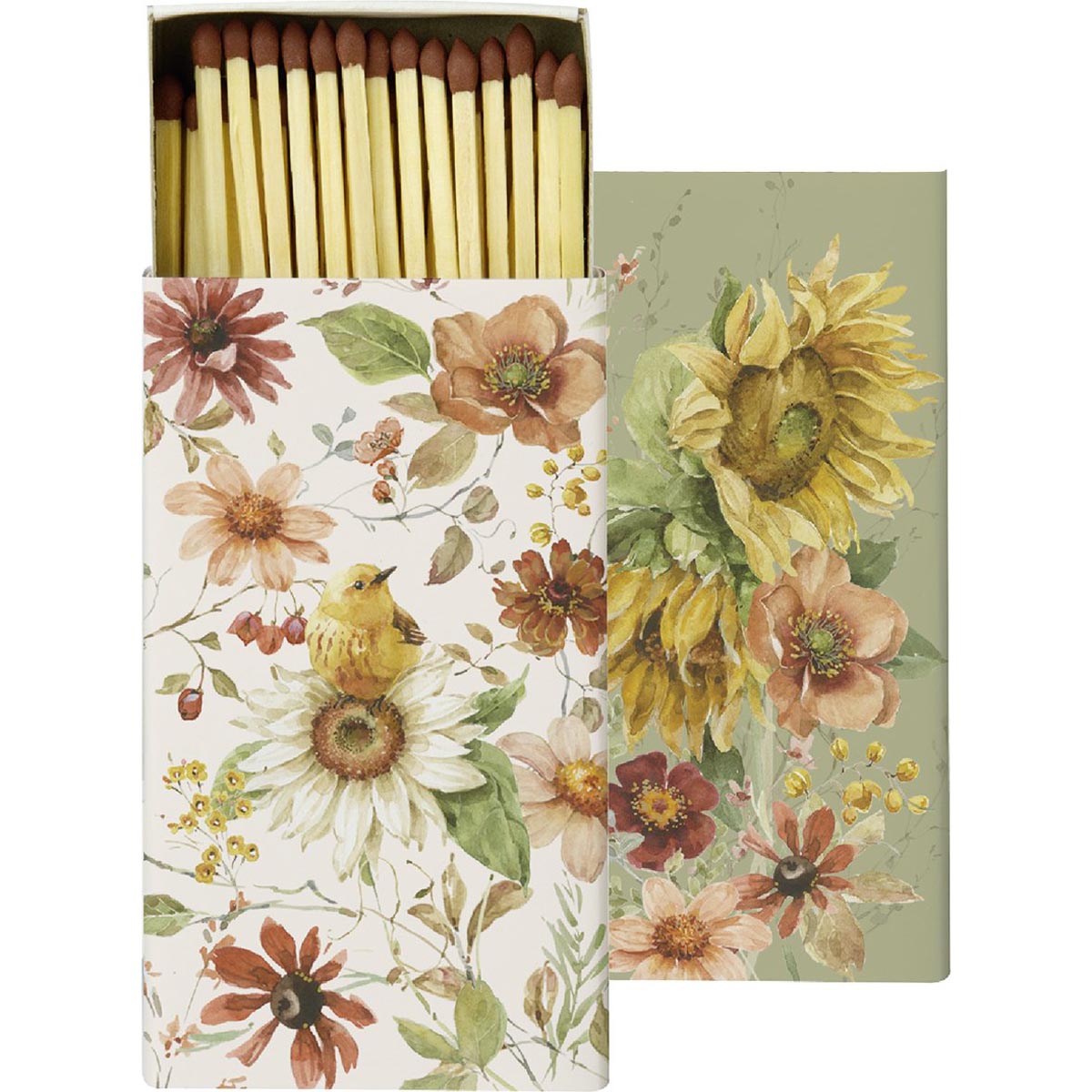 Zündhölzer in herbstlich gestalteter Schachtel mit spätsommerlichen Blumenmotiv