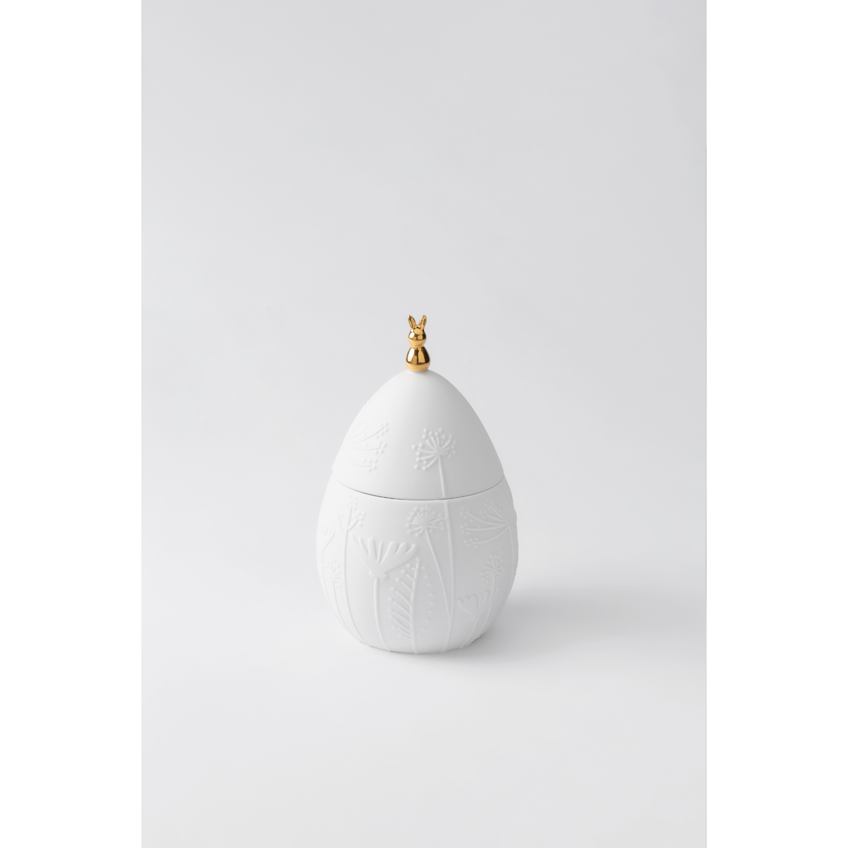 Material: Porzellan, unglasiert mit Relief von Blüten und Ranken, dreidimensionale Häschenfigur auf dem Deckel mit goldenem Decal